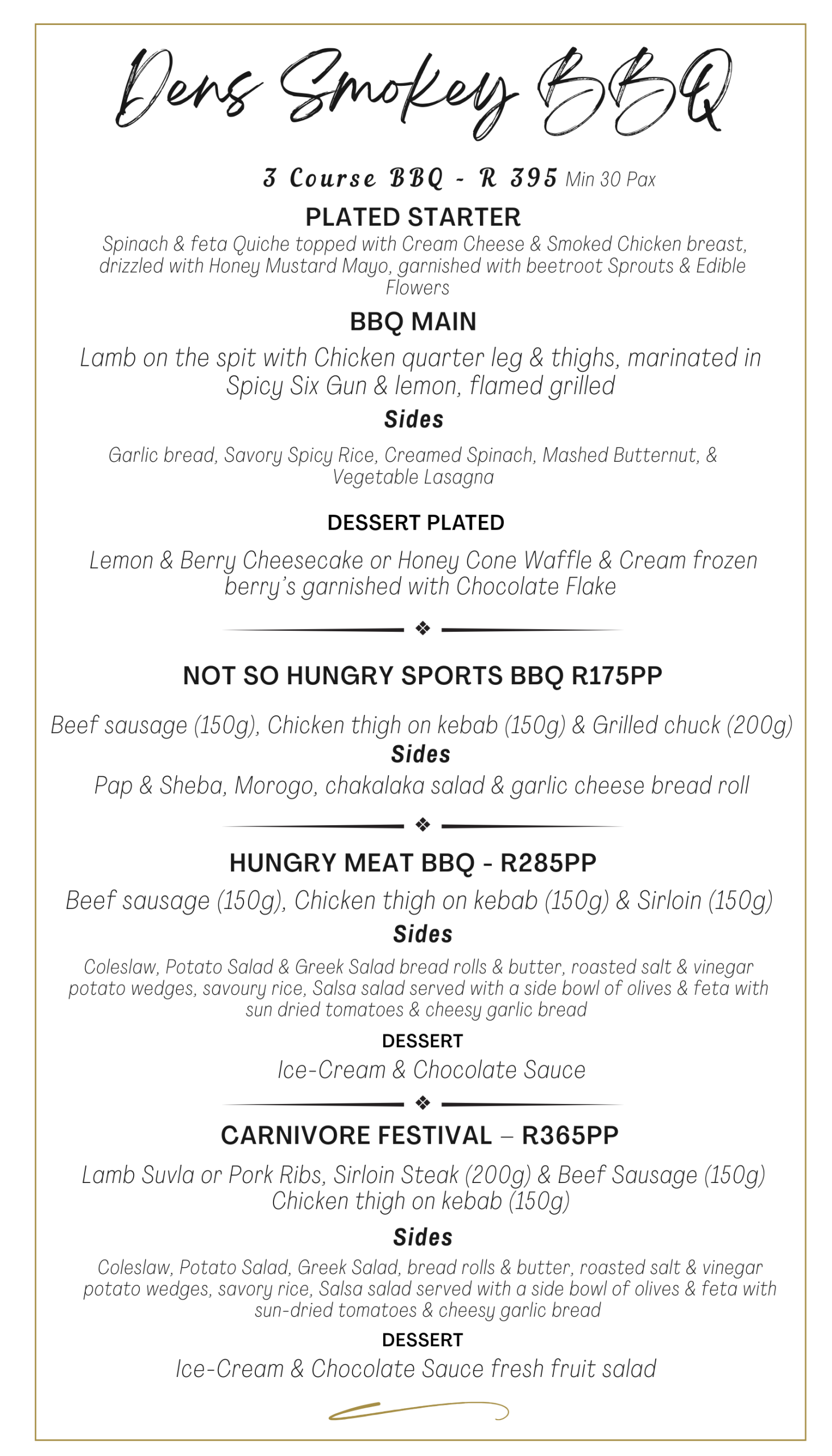 At Jackal Den, We pride ourselves in paying attention to every detail to ensure that you have lasting memories with Friends, Families & collegues for any event. Let us take care of the heavy lifting in order for you to maximise the enjoyment of your desired event.